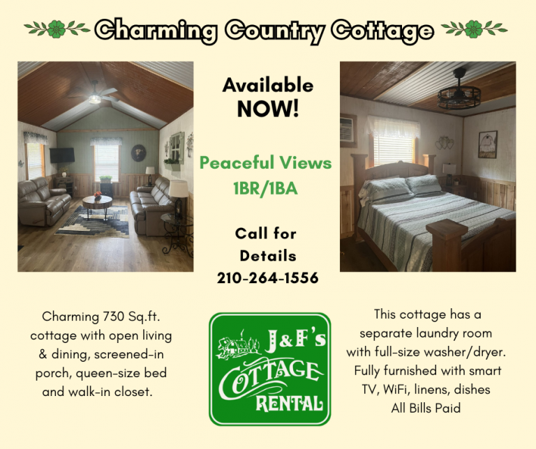 J & F’s Cottage Rental is located in the beautiful Texas Hill Country just minutes from the crystal clear waters of the Guadalupe River and only a few miles from the Guadalupe River State Park. Also, there are a number of local activities to adventure.
